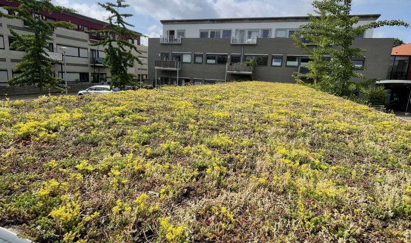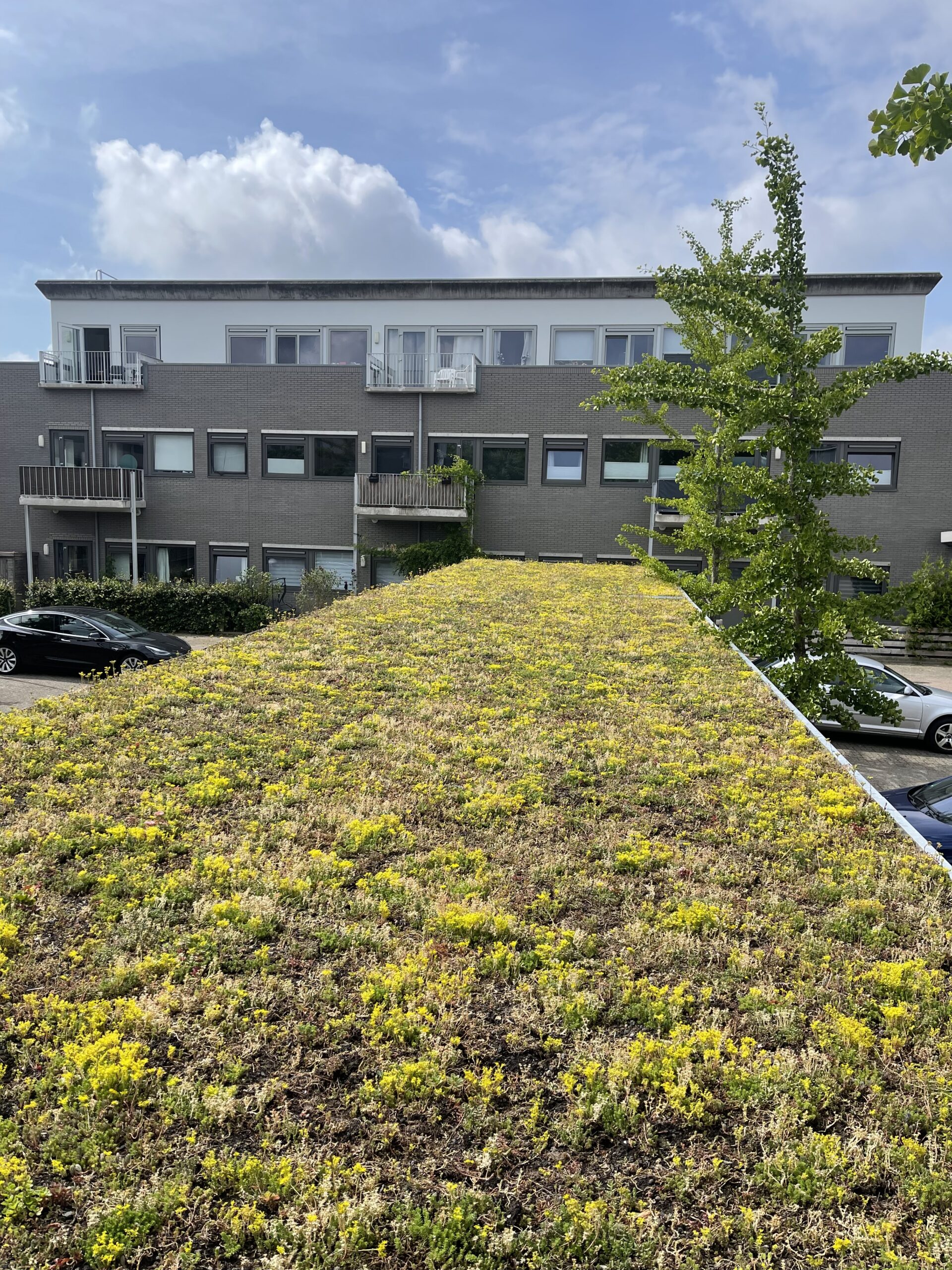 Voor vier fietsenstallingen aan De Molen in Houten realiseerde MASTUM fraaie groendaken. Groendaken worden steeds belangrijker in het stedelijke landschap. Op de daken van de fietsenstallingen zijn drainageplaten geplaatst, waarop een minerale wol is uitgerold. Deze minerale wol neemt water op totdat het verzadigingspunt is bereikt. Hierdoor konden de vegetatiematten direct wortelen. Op de minerale wol zijn sedummixmatten geplaatst. De toegediende zogeheten sedum conditioner zorgt ervoor dat de groendaken langdurig van voeding kunnen worden voorzien.